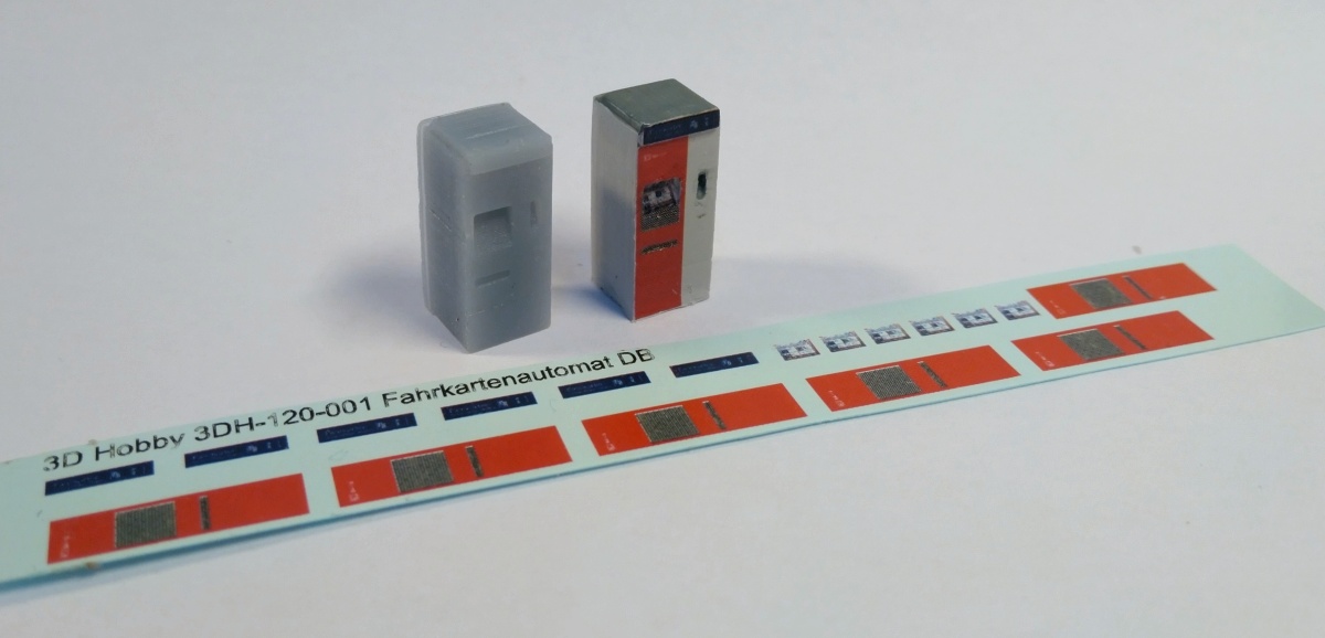 Eine Packung in den Spuren H0, TT und N beinhaltet 5 St. von Automaten aus Resin, sowie passende Abziehbilder. Diese sind mit Lasertechnik gedruckt und bereits versiegelt. Bei dem Zusammenbau ist folgende Reihenfolge zu empfehlen: